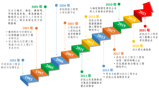 本专业起源于1993年工口漫画 纺织工程系的制冷与空调专业。1999年,工口漫画 热能与动力工程专业正式开办,后于2013年更名为能源与动力工程专业。下设有制冷与空调工程、热能工程2个专业方向。2006年获批热能工程硕士学位授予权,2013年获批山东省特色专业,2017年获批动力工程及工程热物理一级学科硕士学位授权点,2021年设置动力工程领域工程硕士专业学位授权点,同时本科专业增设新能源与储能专业方向。首届本科生毕业于2003年。本专业现有制冷与空调工程、热能工程和新能源与储能三个本科专业方向。其他重要节点参见下图所示