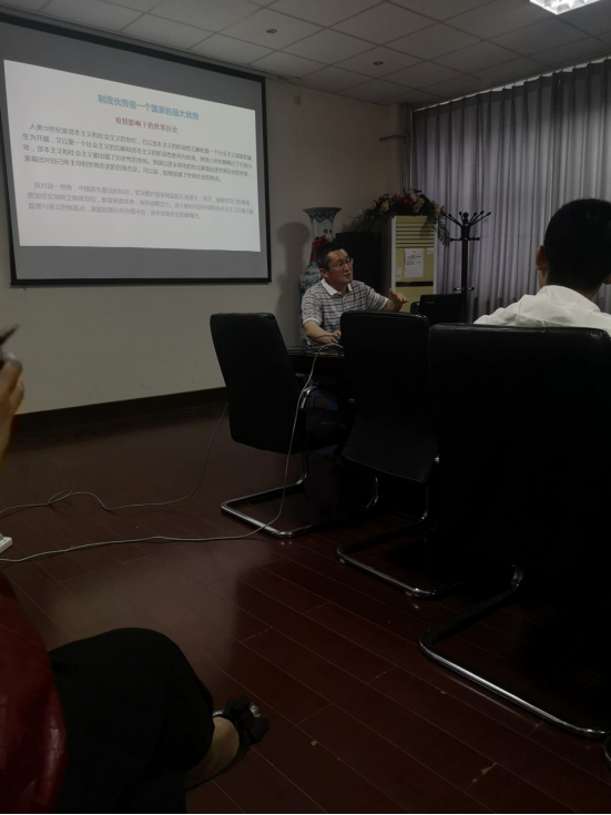 附属医院援鄂医疗队逆行抗疫一线涌现出的先进典型和事例,号召大家要在学习、生活和工作中大力弘扬弘扬众志成城、万众一心、同舟共济、守望相助的伟大抗疫精神;然后围绕疫情下的中国、中国的制度优势两个主要方面,带领大家细数中国防疫重要的时间节点,体会以习近平同志为核心的中共中央坚强领导下,中国采取最全面、严格的防控举措,精准施策中深刻反映的抗击疫情的“中国智慧”;通过分析人权、政权、主权体现的抗疫价值取向、中西疫情叙事的差异、中西两种经济学叙事差异、我国在中国共产党领导下应对重大事件的制度优势与组织优势等,阐明了我国国家治理体系与治理能力现代化的显著效能,彰显了党中央集中统一领导的核心凝聚力、中国特色社会主义制度的高效执行力以及中国共产党强劲的社会动员力,深刻的阐述了中国特色社会主义的制度优势,要求全体同学要坚定“四个自信”,以实际行动践行“四个意识”,始终做到“两个维护”。