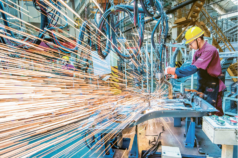 今年以来,我国统筹疫情防控和经济社会发展,加强宏观政策应对力度,推动经济稳步前行、逐步向好、不断升级,我国经济前三季度同比增长0.7%,全年实现正增长已成定局。图为2020年9月15日,工人在江淮汽车山东分公司冲焊车间内焊接作业。 人民图片 王继林/摄