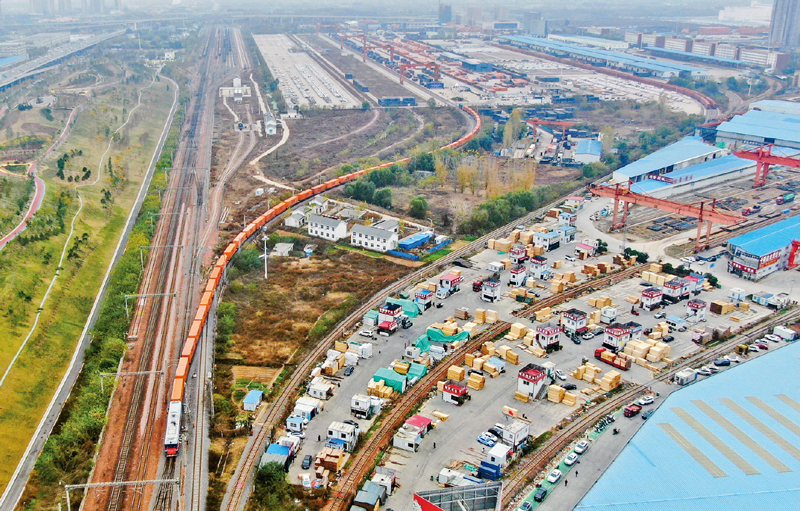 据中国国家铁路集团有限公司统计显示,截至11月5日,中欧班列今年开行已达10180列,再次创造新纪录,战略通道作用更加凸显,为维护国际产业链供应链安全稳定提供了有力支撑。图为2020年11月20日,中欧班列(中国郑州至芬兰赫尔辛基)驶出中国铁路郑州局集团有限公司圃田车站(无人机照片)。 新华社记者 郝源/摄