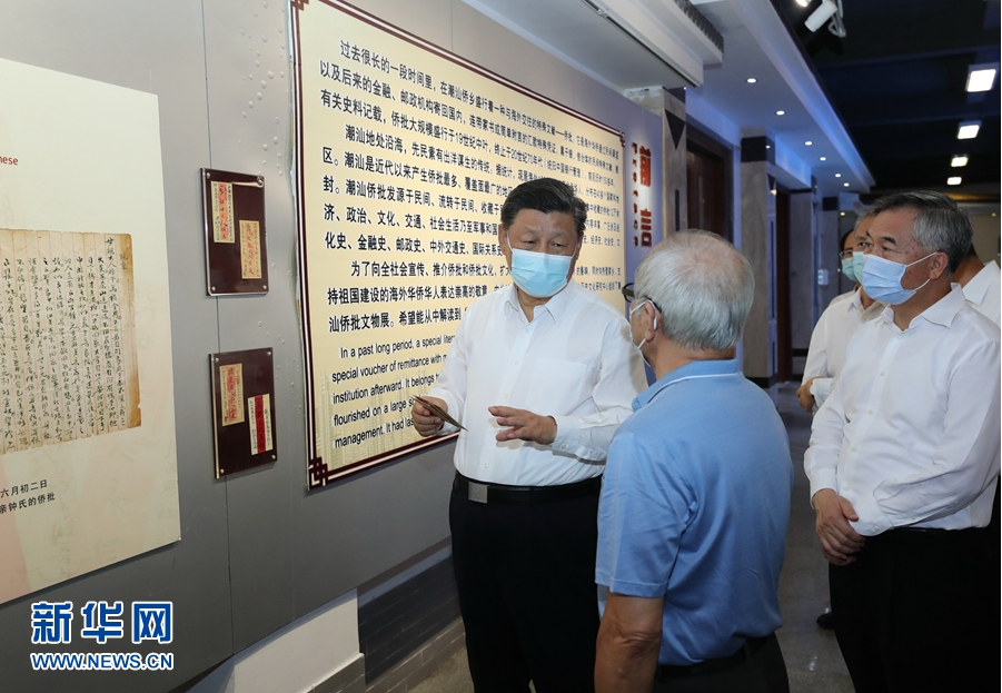 随后,习近平参观了具有潮汕侨乡特色的侨批文物馆。过去很长一段时间,海外华侨通过民间渠道将连带家书或简单附言的汇款凭证寄回国内,这些“侨批”成为研究近代华侨史的珍贵档案。习近平听取侨批历史和潮汕华侨文化介绍。他强调,“侨批”记载了老一辈海外侨胞艰难的创业史和浓厚的家国情怀,也是中华民族讲信誉、守承诺的重要体现。要保护好这些“侨批”文物,加强研究,教育引导人们不忘近代我国经历的屈辱史和老一辈侨胞艰难的创业史,并推动全社会加强诚信建设。潮汕地区是我国著名侨乡。汕头经济特区要根据新的实际做好“侨”的文章,加强海外华侨工作,引导和激励他们在支持和参与祖国现代化建设、弘扬中华文化、促进祖国和平统一、密切中外交流合作等方面发挥更大作用。