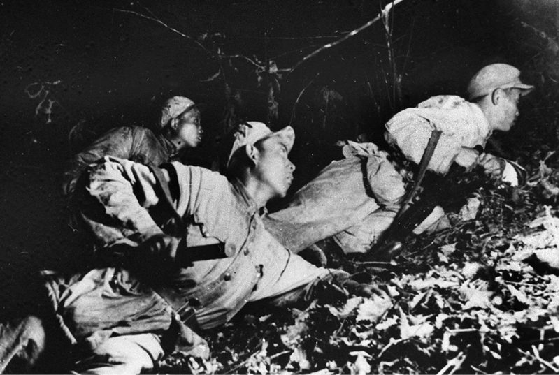 在1952年秋季的上甘岭战役中,中国人民志愿军与6万多敌人浴血激战43天,打退其900多次进攻,坚守住了阵地,毙伤俘敌2.5万余人,体现了大无畏的革命英雄主义和爱国主义、国际主义精神。图为坚守在坑道里的战士夜间出击。 新华社发