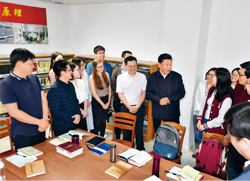 2018年5月2日,中共中央总书记、国家主席、中央军委主席习近平来到北京大学考察。这是习近平在北京大学马克思主义学院,与正在就“解读新时代”进行座谈交流的中外学生亲切交谈。